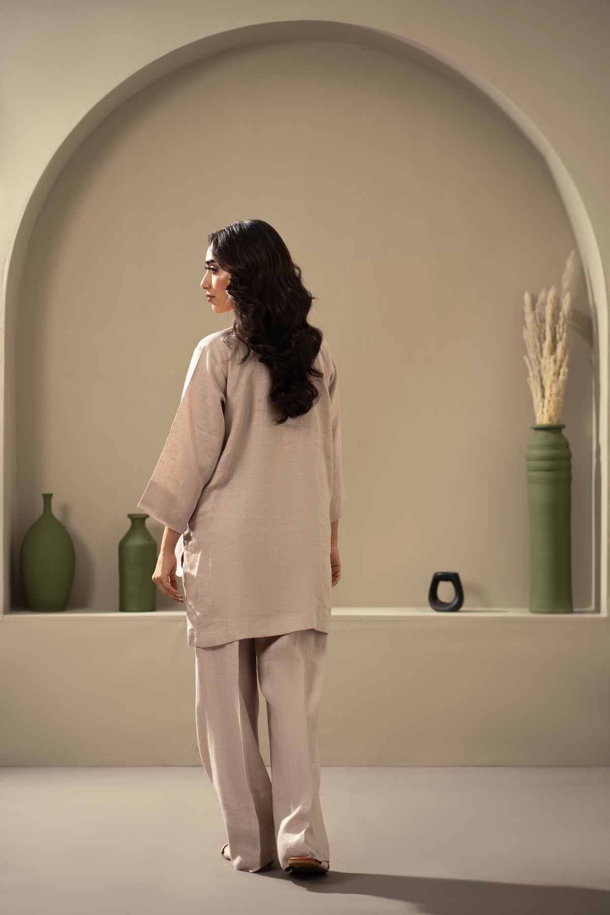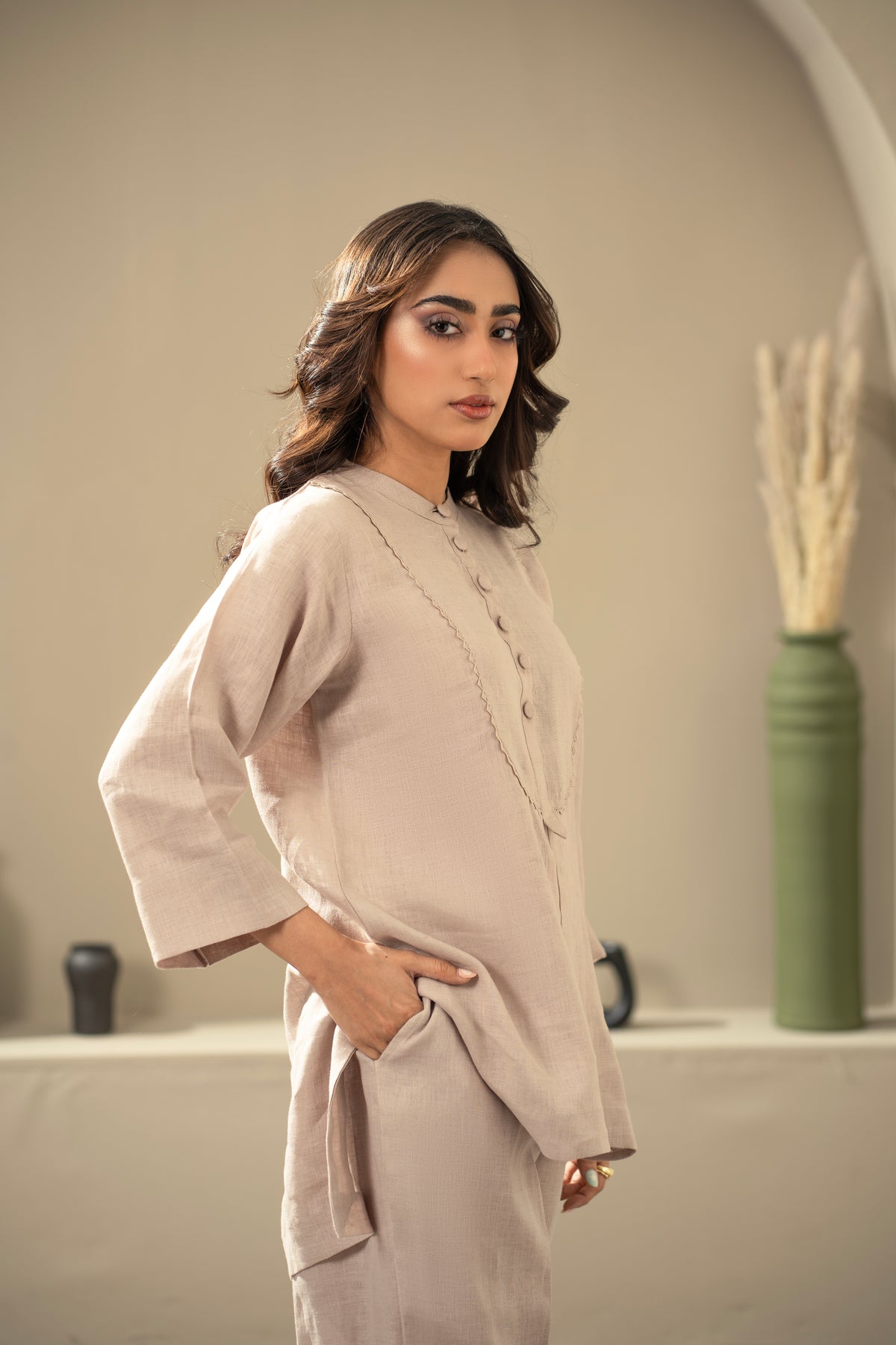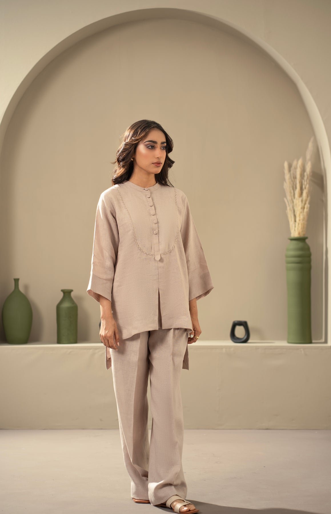 Crafted from linen, this co-ord set includes a straight-cut button-down shirt with a longer back and wide-leg trousers with pockets. Lightweight and breathable for everyday wear.