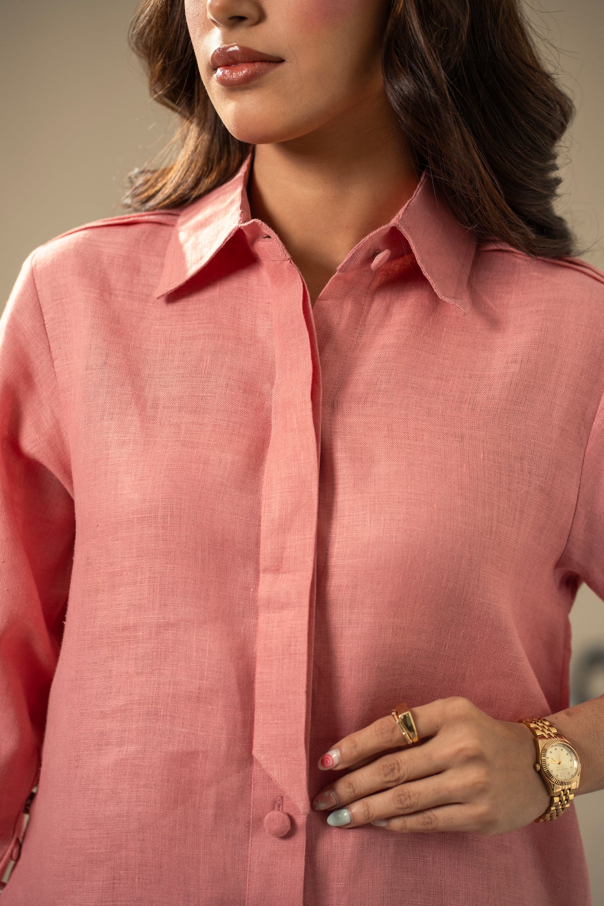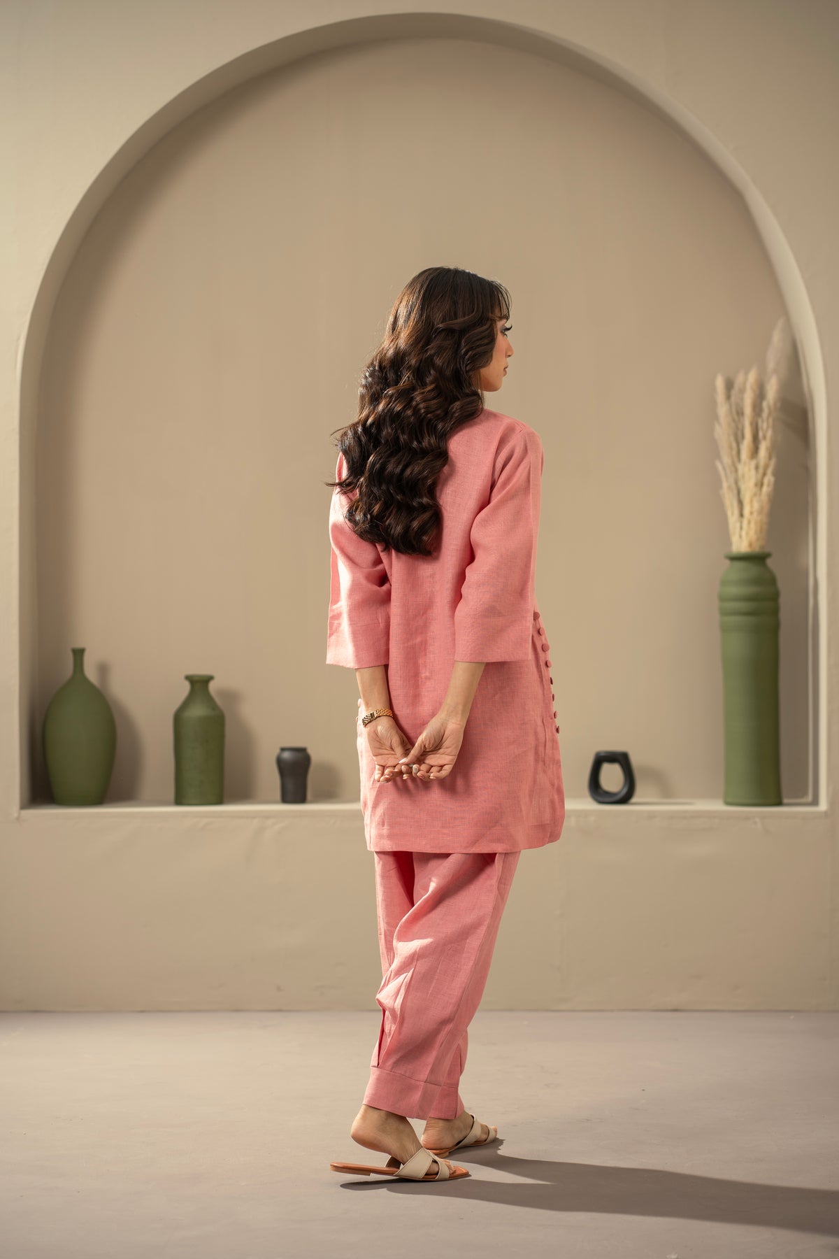 This co-ord set features a collared shirt kurta with a 3D neckline and button detailing along the side, paired with straight shalwar finished with cuffs. Designed for a structured yet relaxed fit.