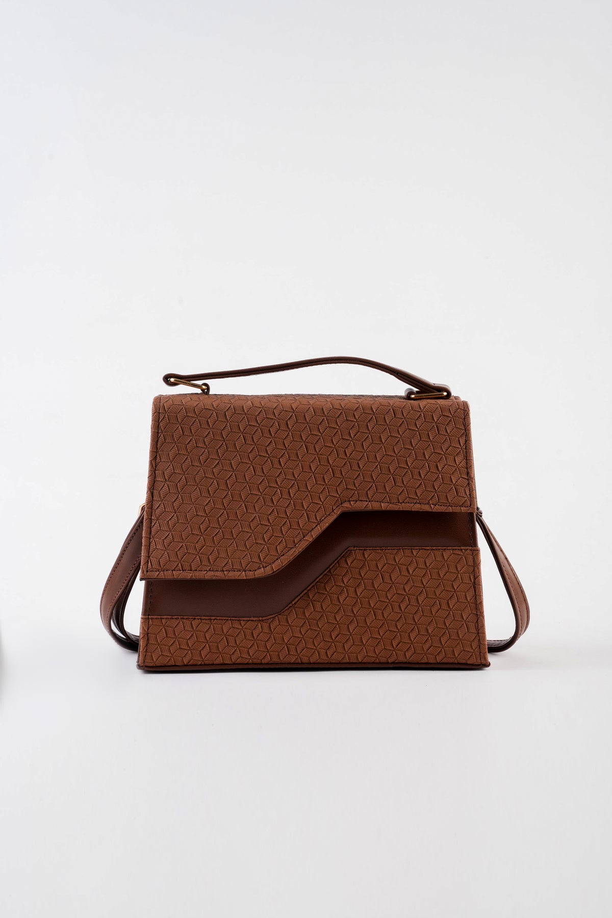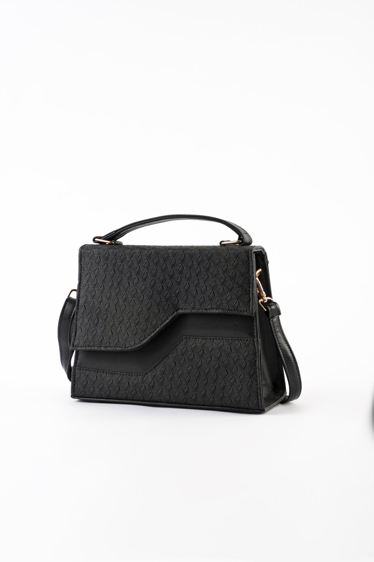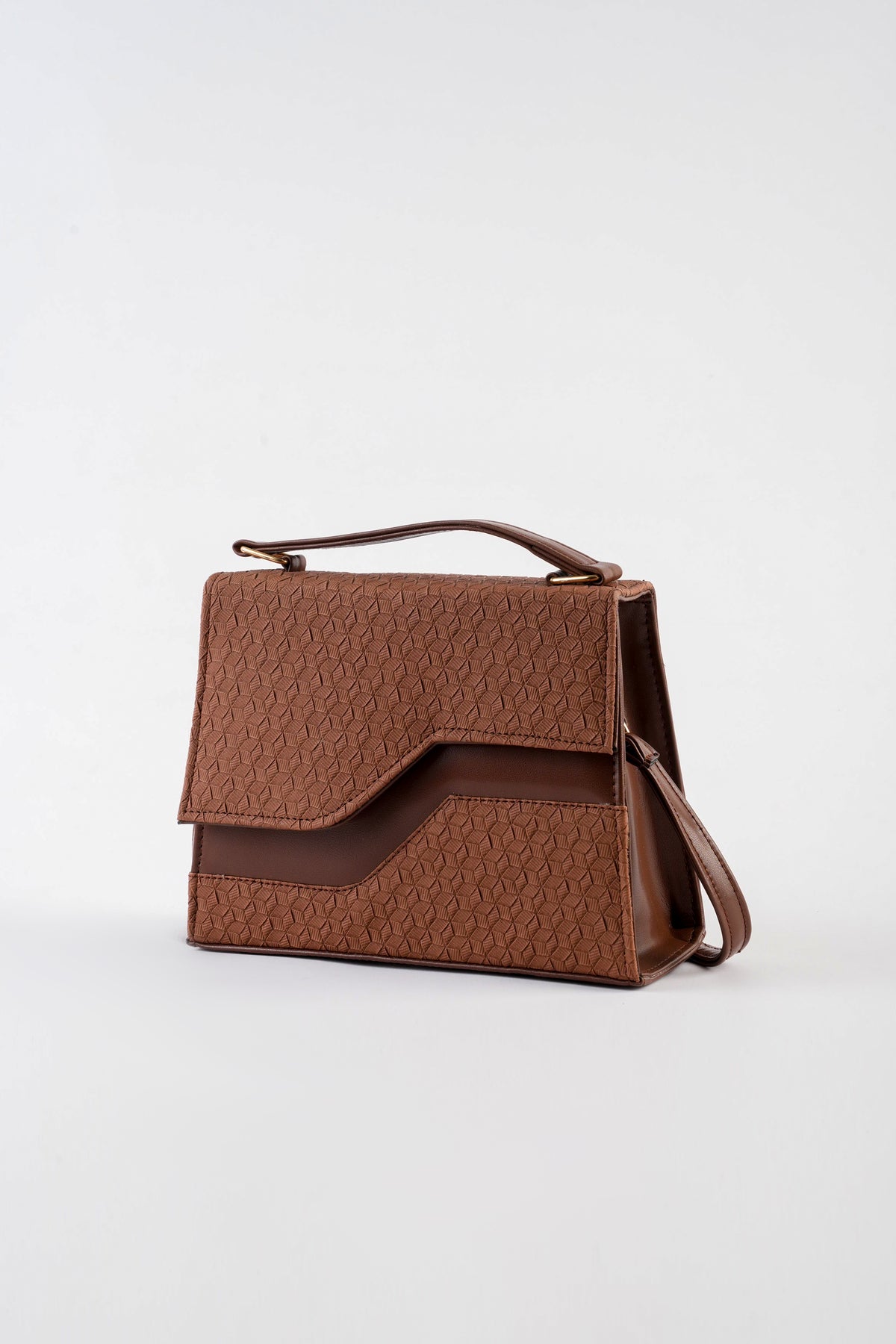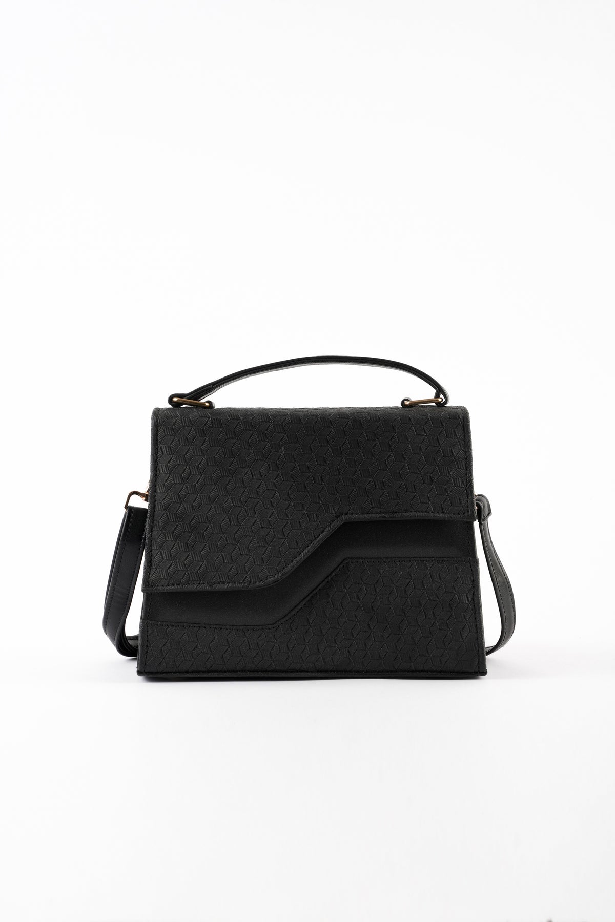 Top handle bag featuring an asymmetric textured front flap with metal button closure. Comes with a detachable and adjustable crossbody strap.