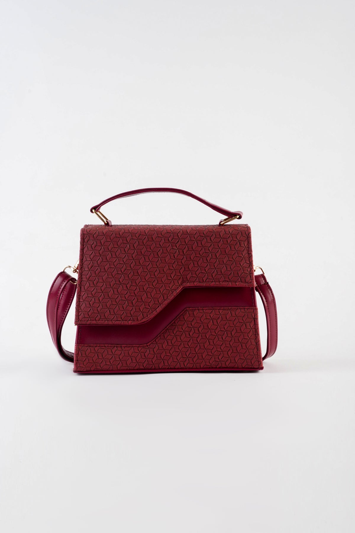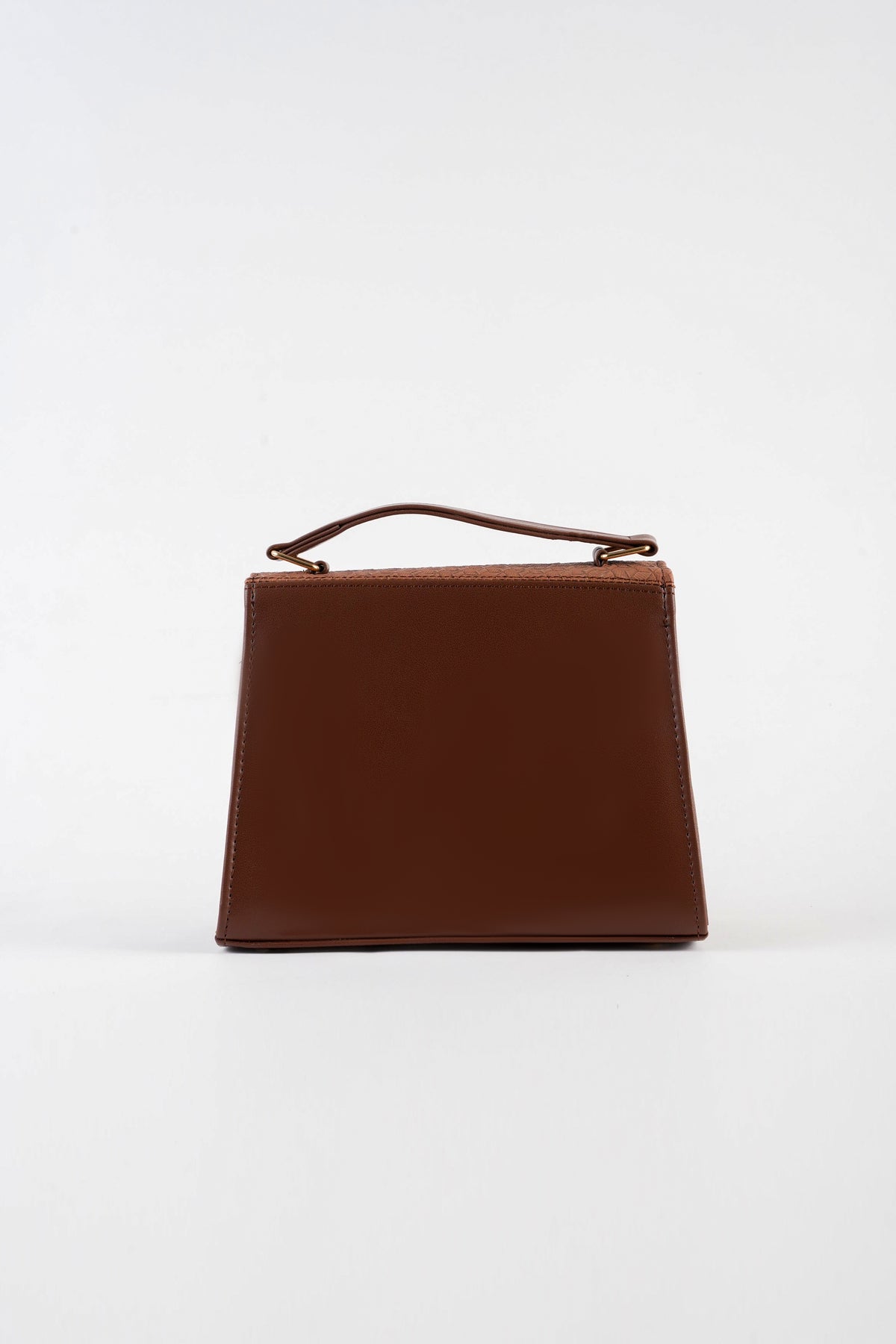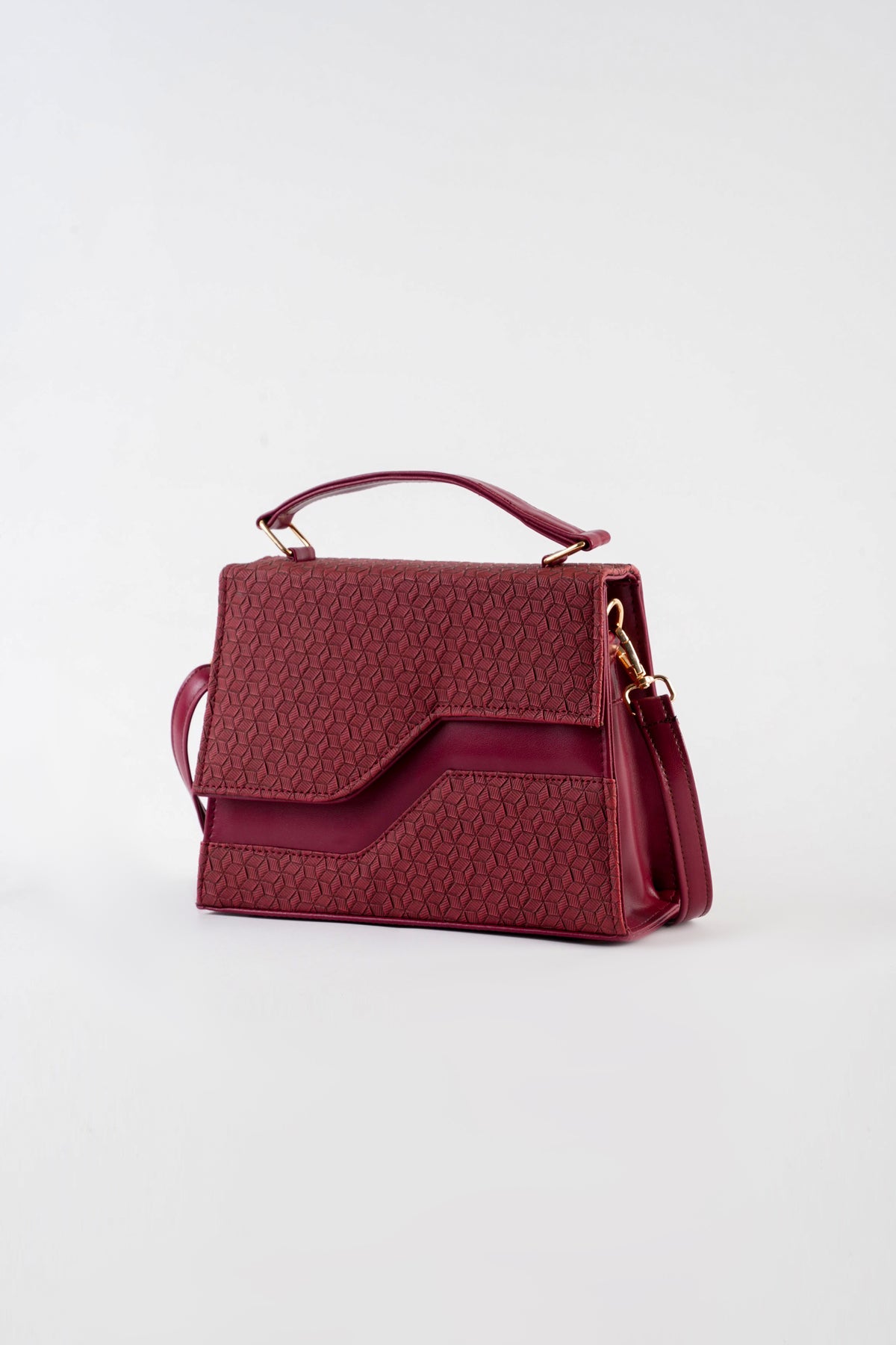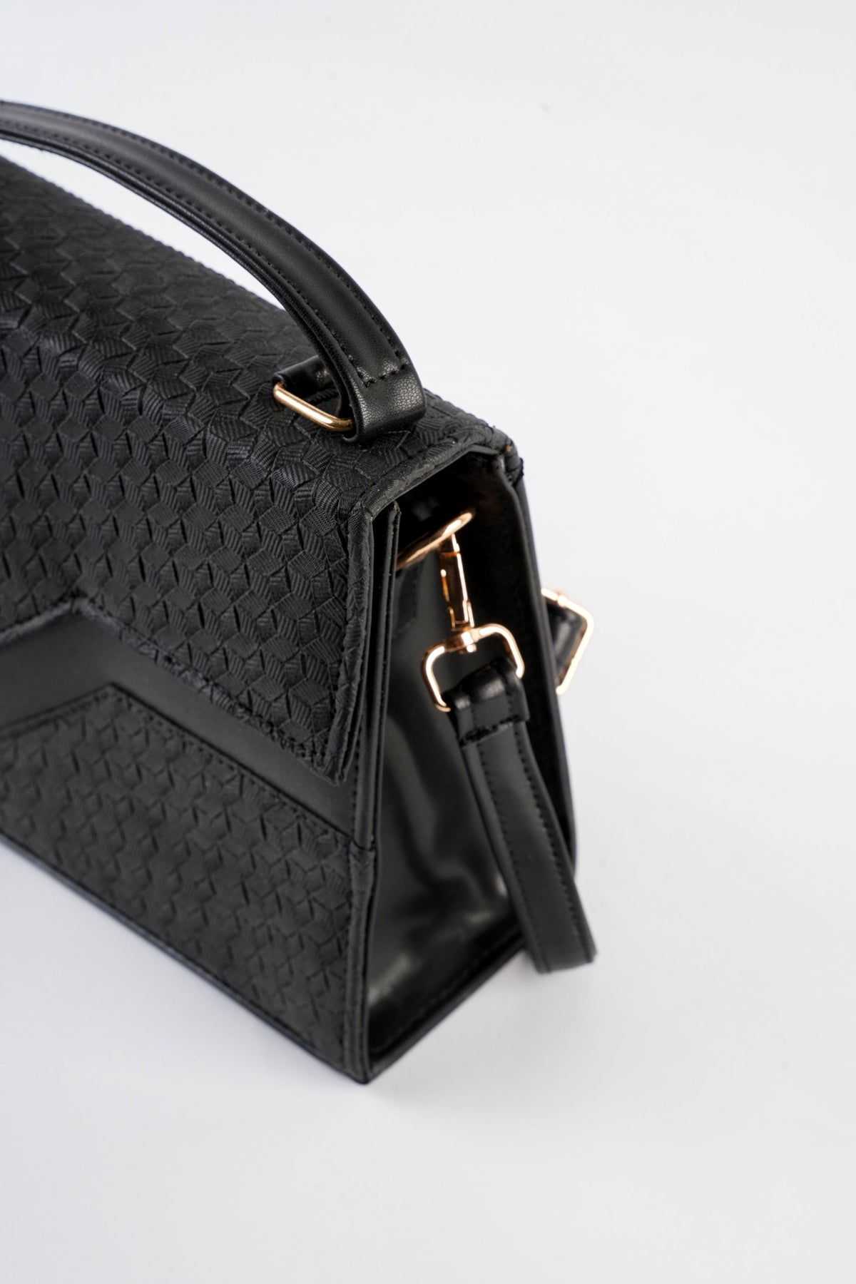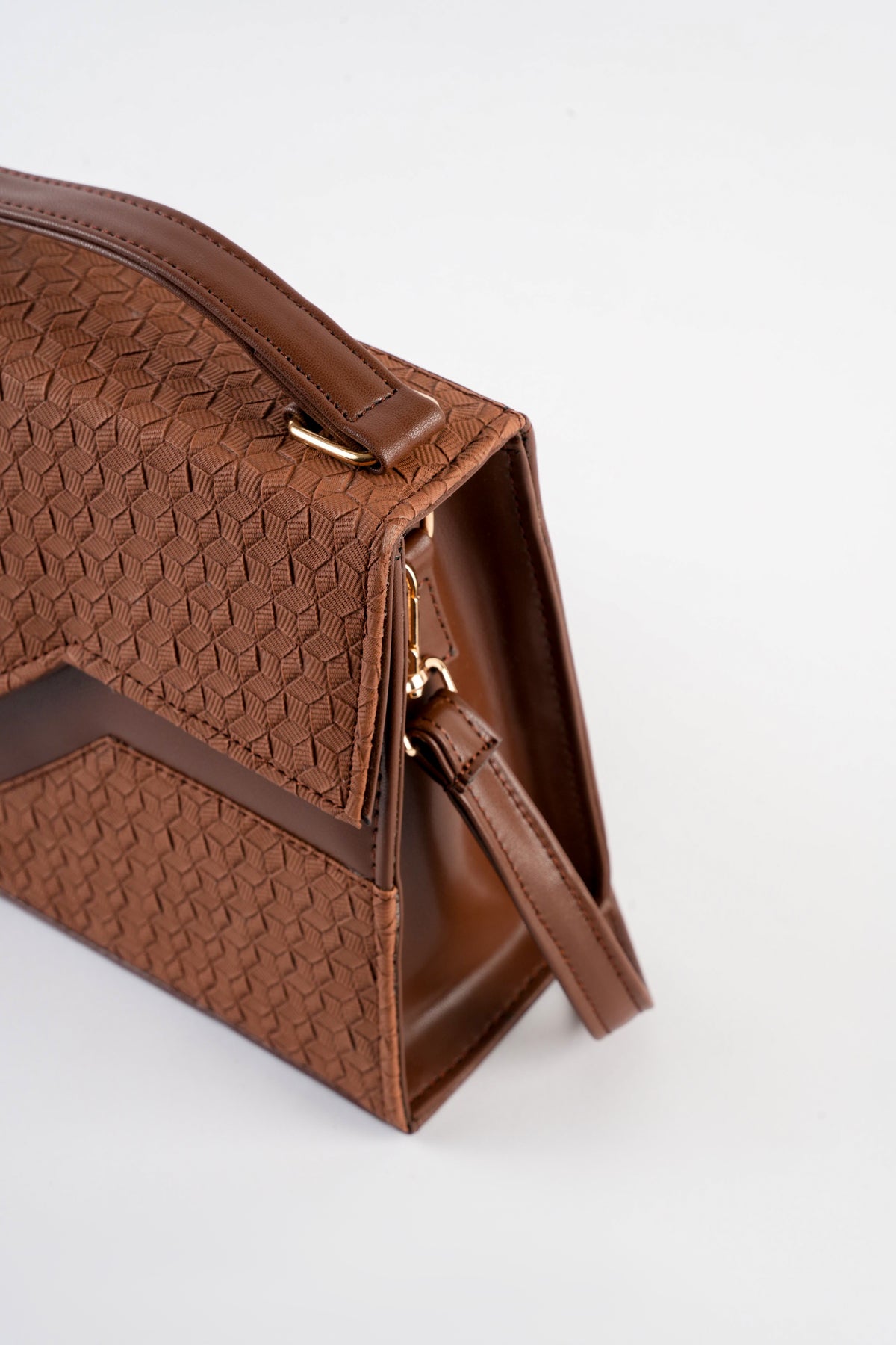 Top handle bag featuring an asymmetric textured front flap with metal button closure. Comes with a detachable and adjustable crossbody strap.