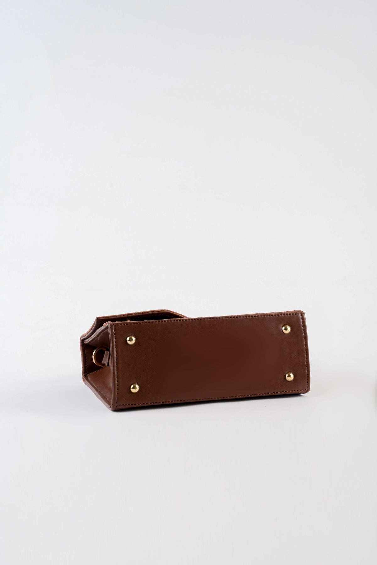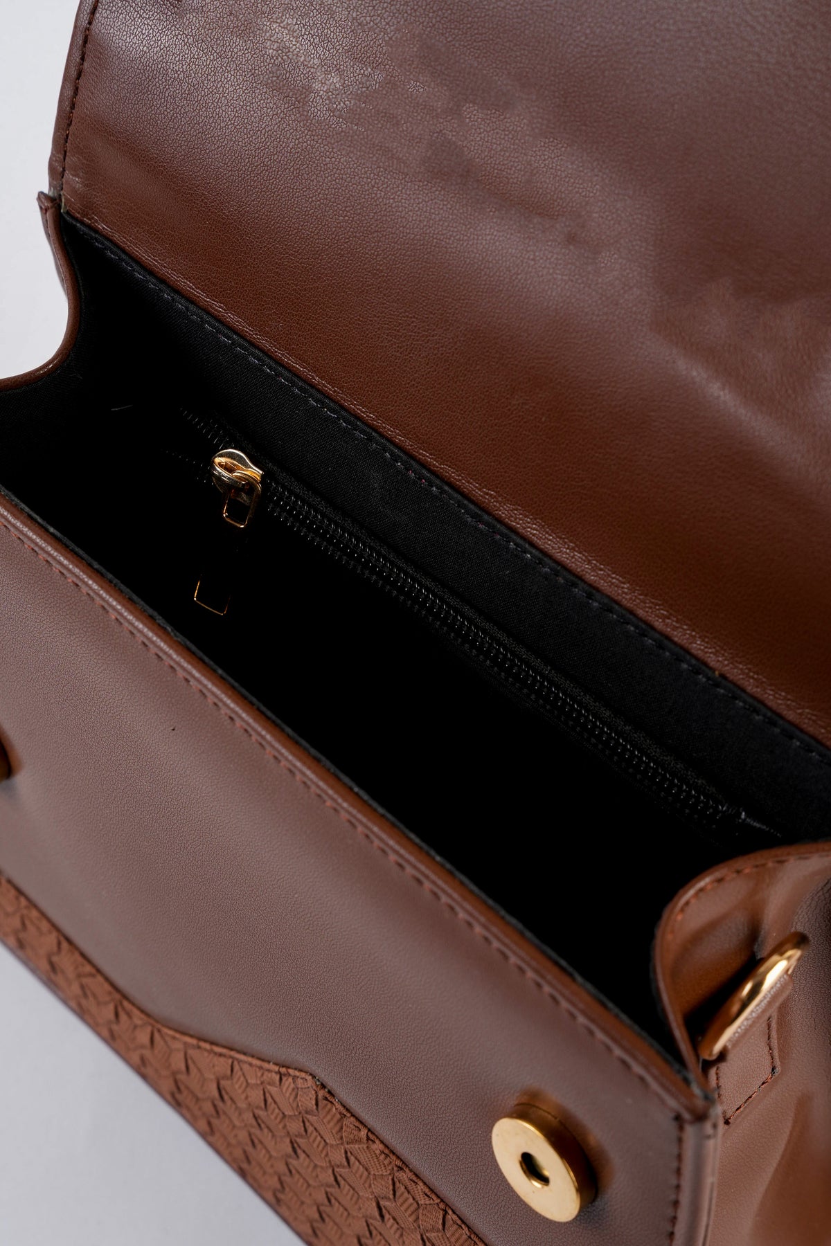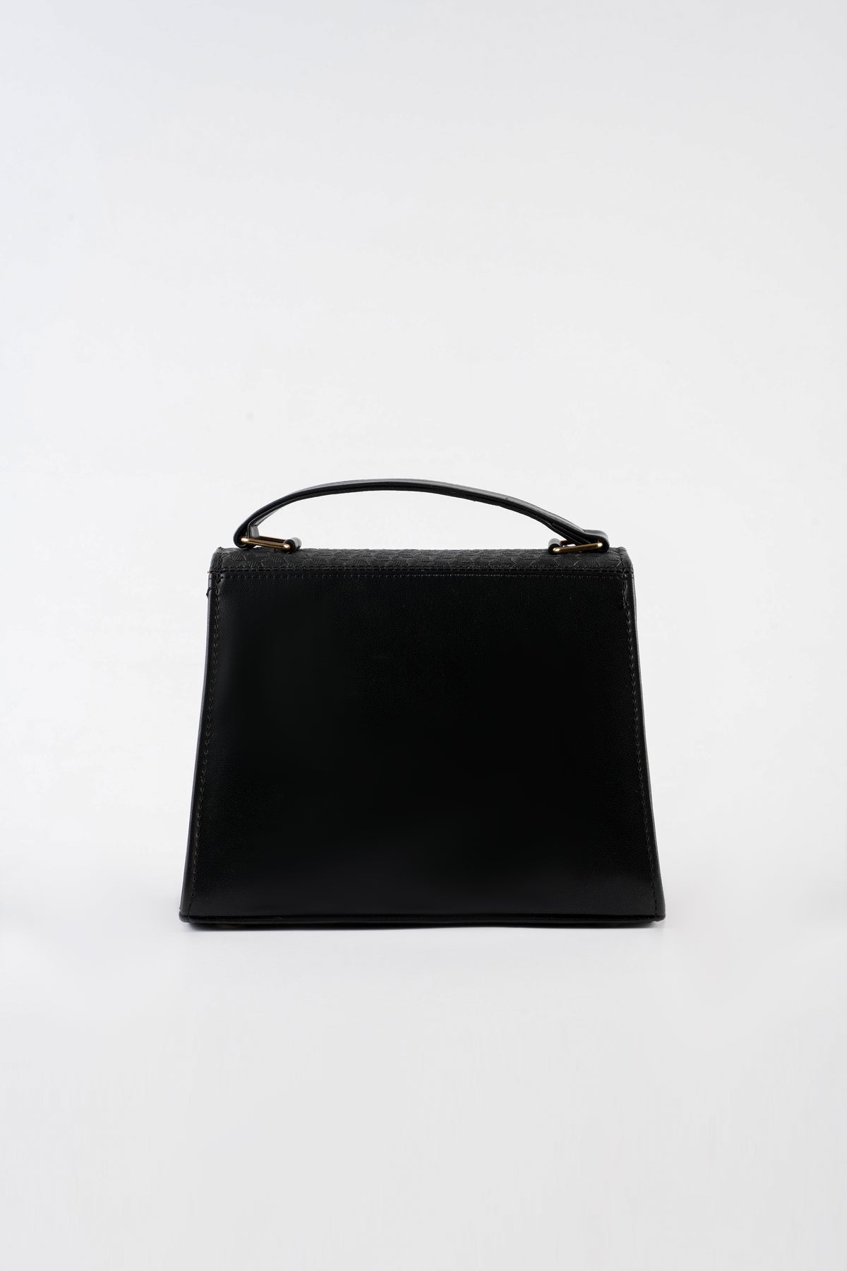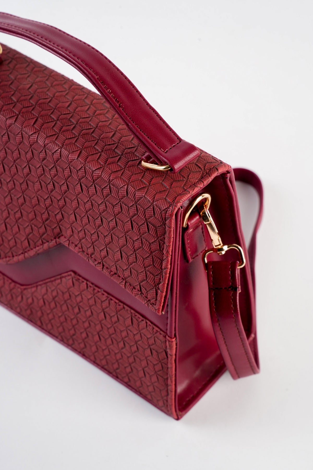Top handle bag featuring an asymmetric textured front flap with metal button closure. Comes with a detachable and adjustable crossbody strap.
