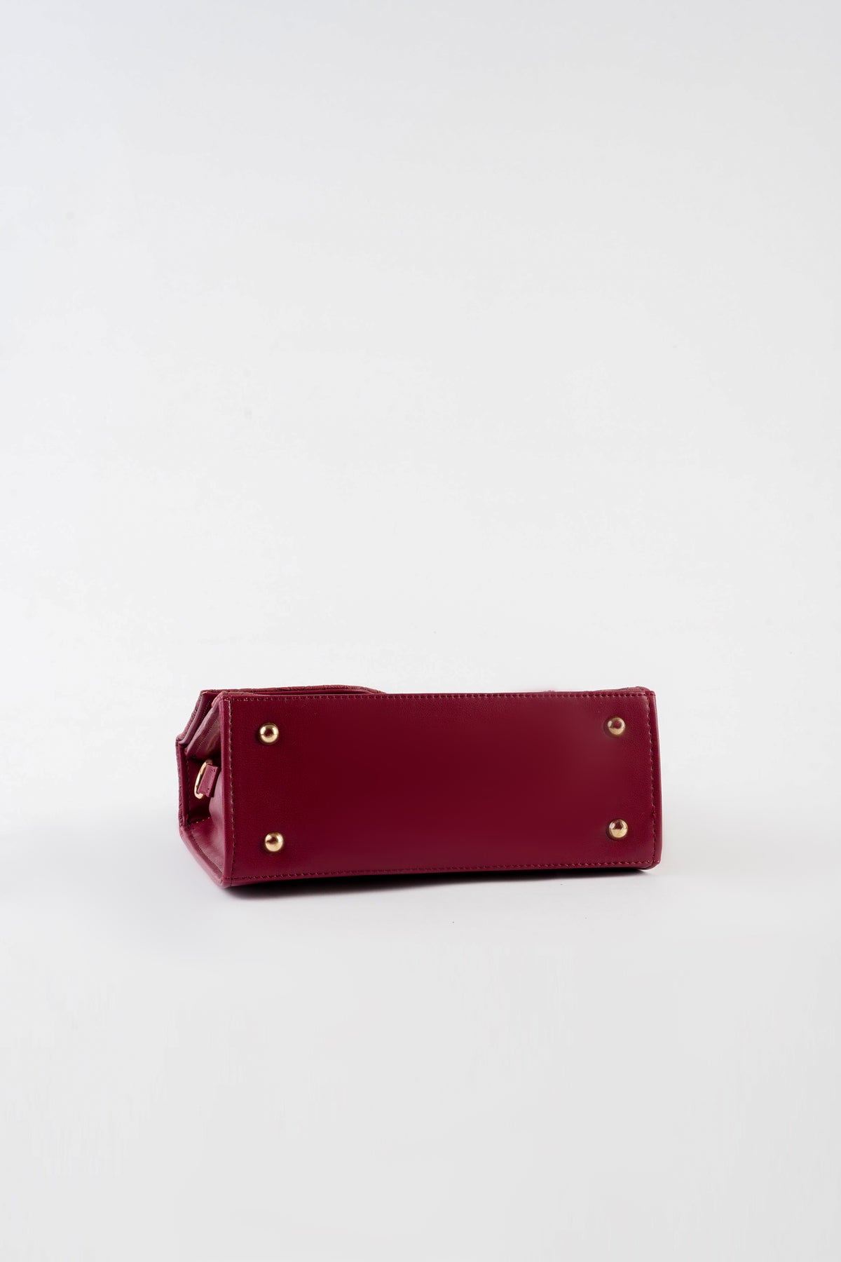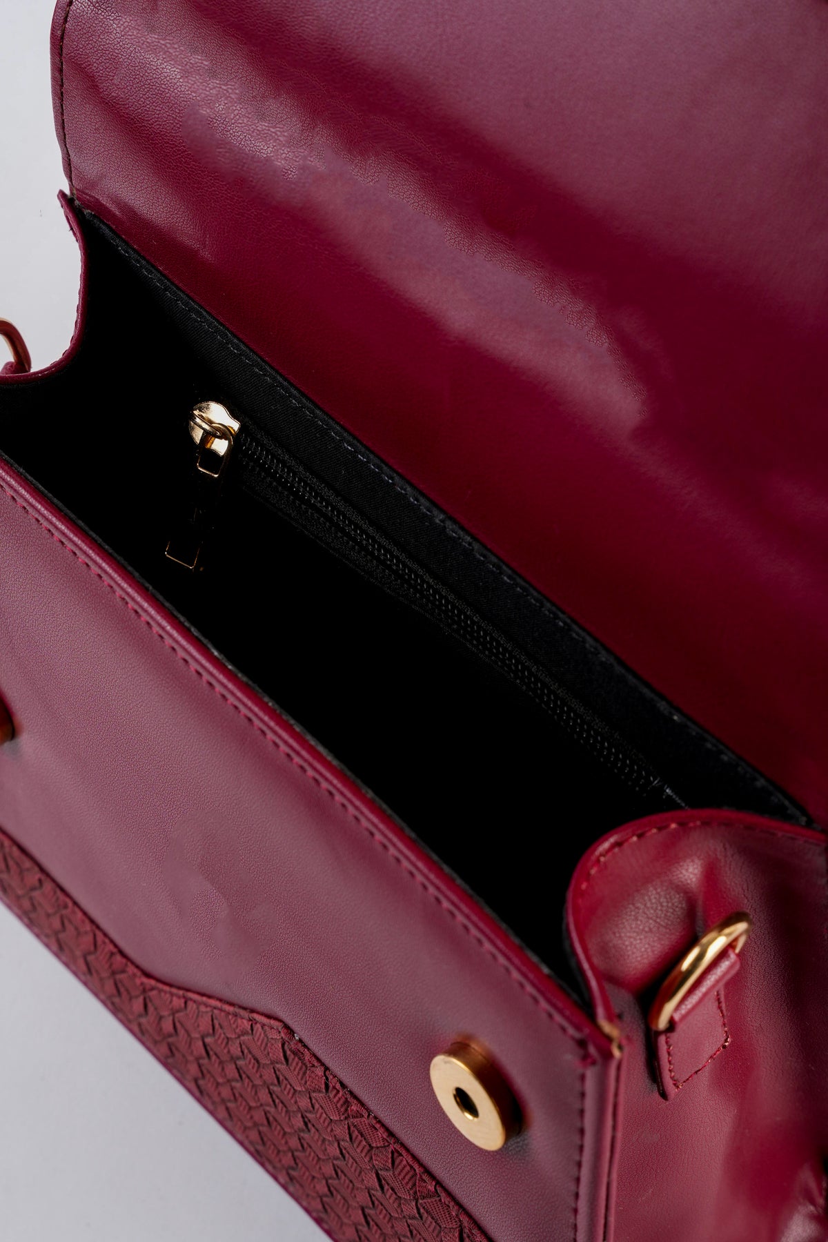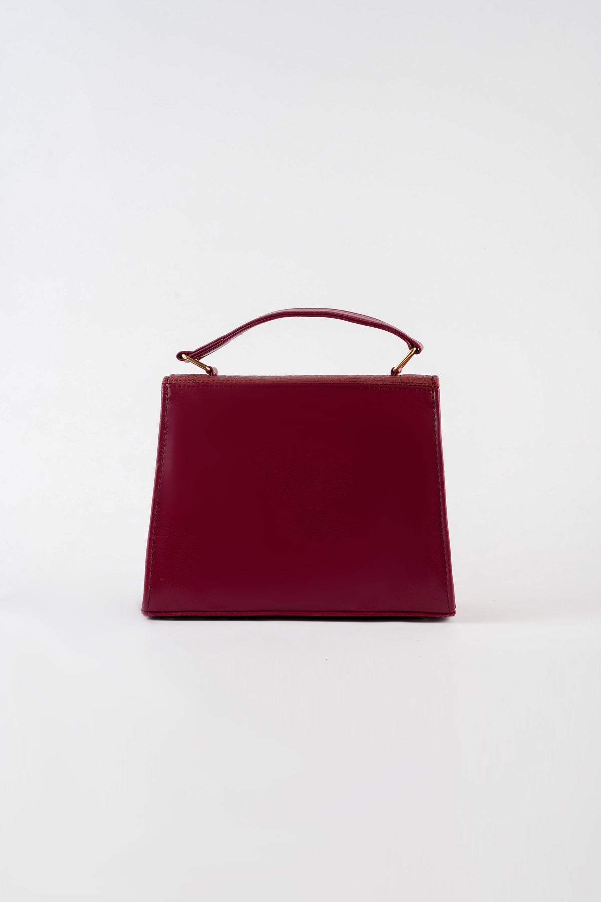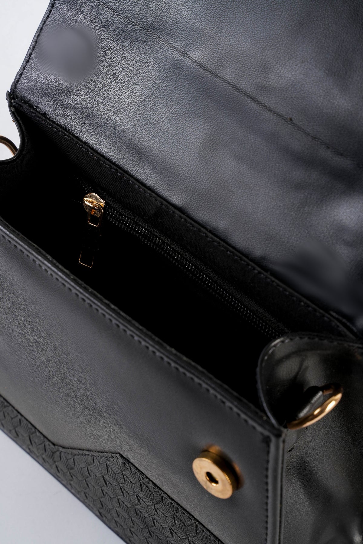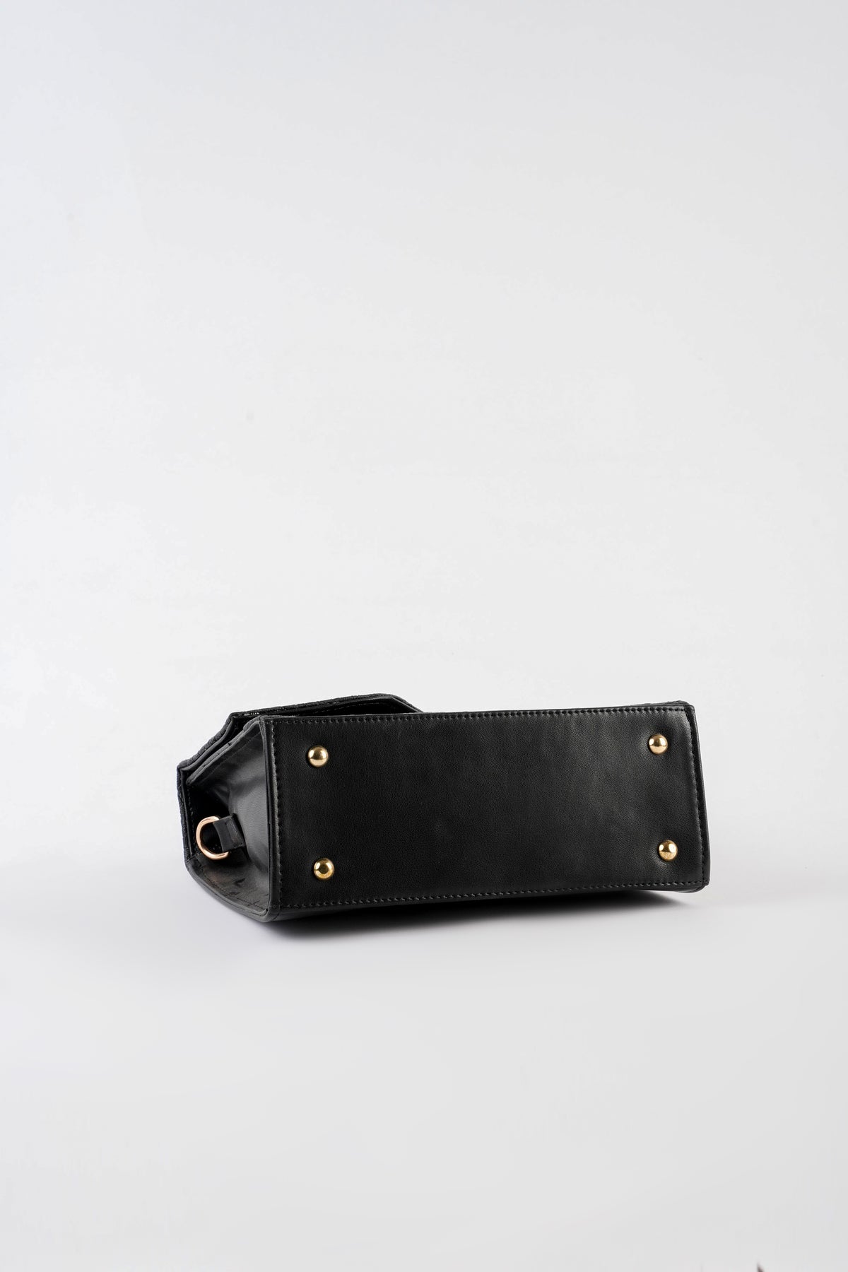 Top handle bag featuring an asymmetric textured front flap with metal button closure. Comes with a detachable and adjustable crossbody strap.
