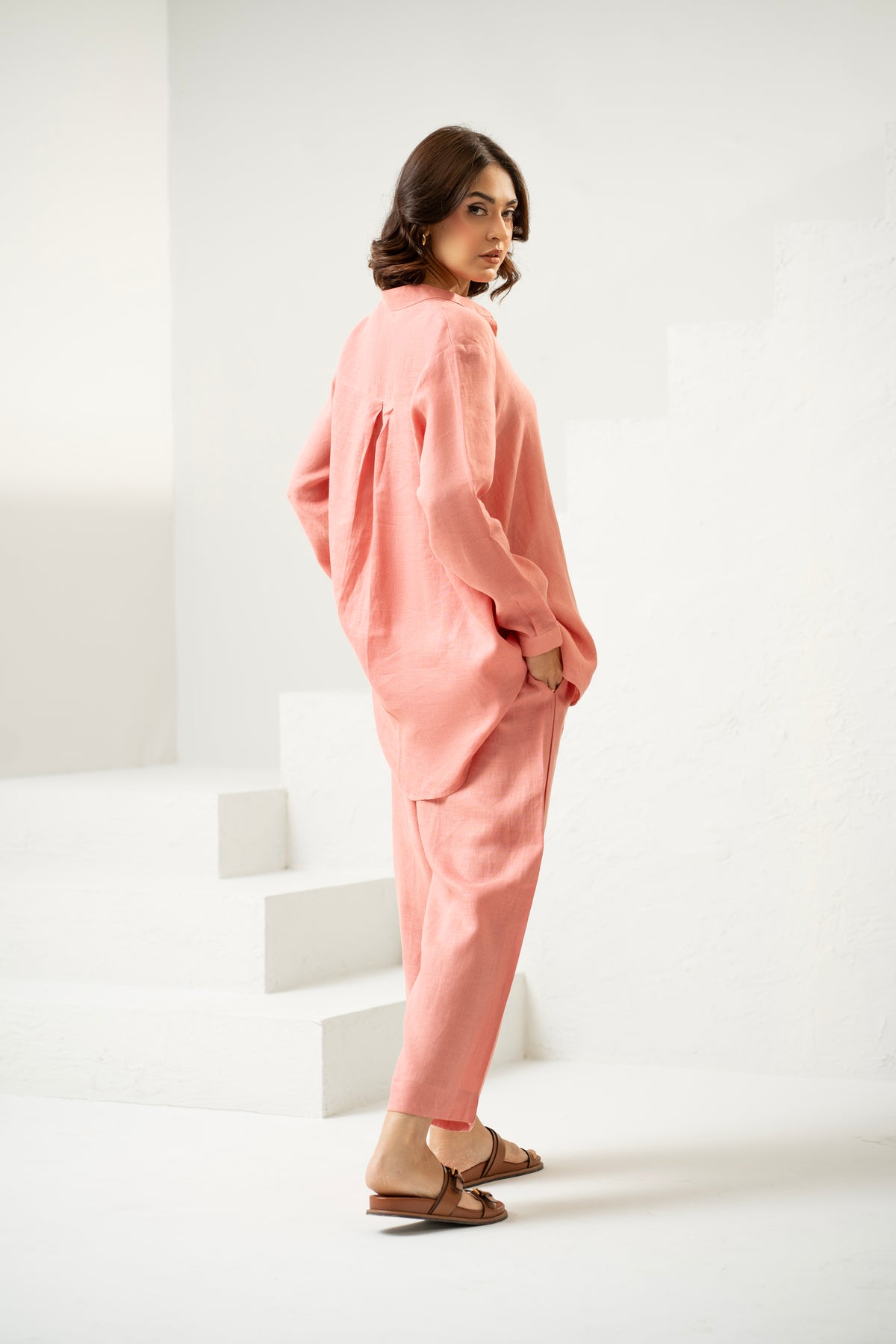 Crafted from linen, this co-ord set includes a straight-cut button-down shirt with a longer back and wide-leg trousers with pockets. Lightweight and breathable for everyday wear.